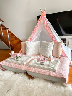 Everything you need for an amazing slumber party with friends is included. Both full set up and DIY come with the same inclusions. Our beautiful white double Teepee is gorgeous to match with any theme. Our blankets are luxurious and our linen is crisp. The breakfast trays can be set up anywhere in your intended space and our lanterns and fairy lights light up so pretty as if you are sleeping under the stars. There's a matching letter sign with an easel for the special one, along with so many matching accessories and decorations to make an enchanted and magical teepee slumber party!