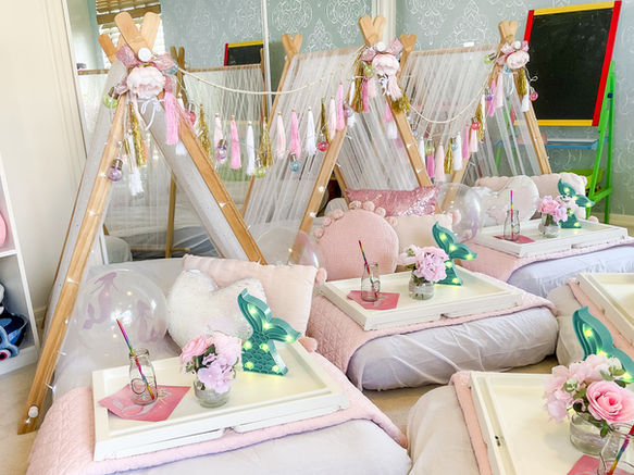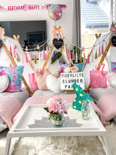 Everything you need for an amazing slumber party with friends is included. Both full set up and DIY come with the same inclusions. Our beautiful handmade Teepees have lace or sheer sparkly covers. Our blankets are luxurious and our linen is crisp. The breakfast trays can be set up anywhere in your intended space and our lanterns and fairy lights light up so pretty as if you are sleeping under the stars. There's a matching letter sign with an easel for the special one, along with so many matching accessories and decorations to make an enchanted and magical teepee slumber party!