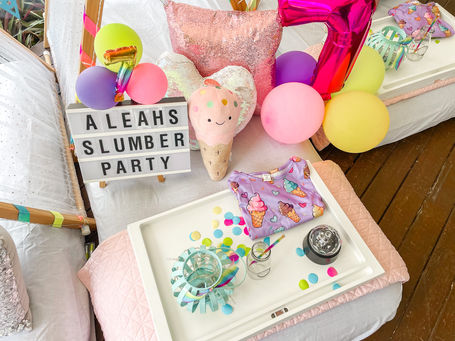 Everything you need for an amazing slumber party with friends is included. Both full set up and DIY come with the same inclusions. Our beautiful handmade Teepees have lace or sheer sparkly covers. Our blankets are luxurious and our linen is crisp. The breakfast trays can be set up anywhere in your intended space and our lanterns and fairy lights light up so pretty as if you are sleeping under the stars. There's a matching letter sign with an easel for the special one, along with so many matching accessories and decorations to make an enchanted and magical teepee slumber party!