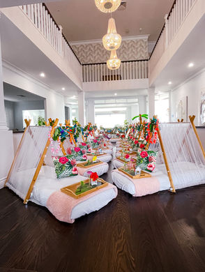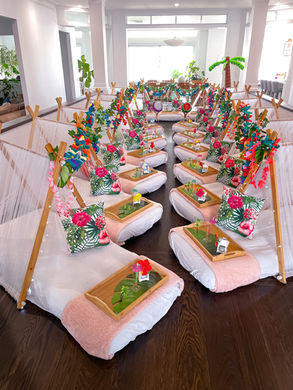 Everything you need for an amazing slumber party with friends is included. Both full set up and DIY come with the same inclusions. Our beautiful handmade Teepees have lace or sheer sparkly covers. Our blankets are luxurious and our linen is crisp. The breakfast trays can be set up anywhere in your intended space and our lanterns and fairy lights light up so pretty as if you are sleeping under the stars. There's a matching letter sign with an easel for the special one, along with so many matching accessories and decorations to make an enchanted and magical teepee slumber party!